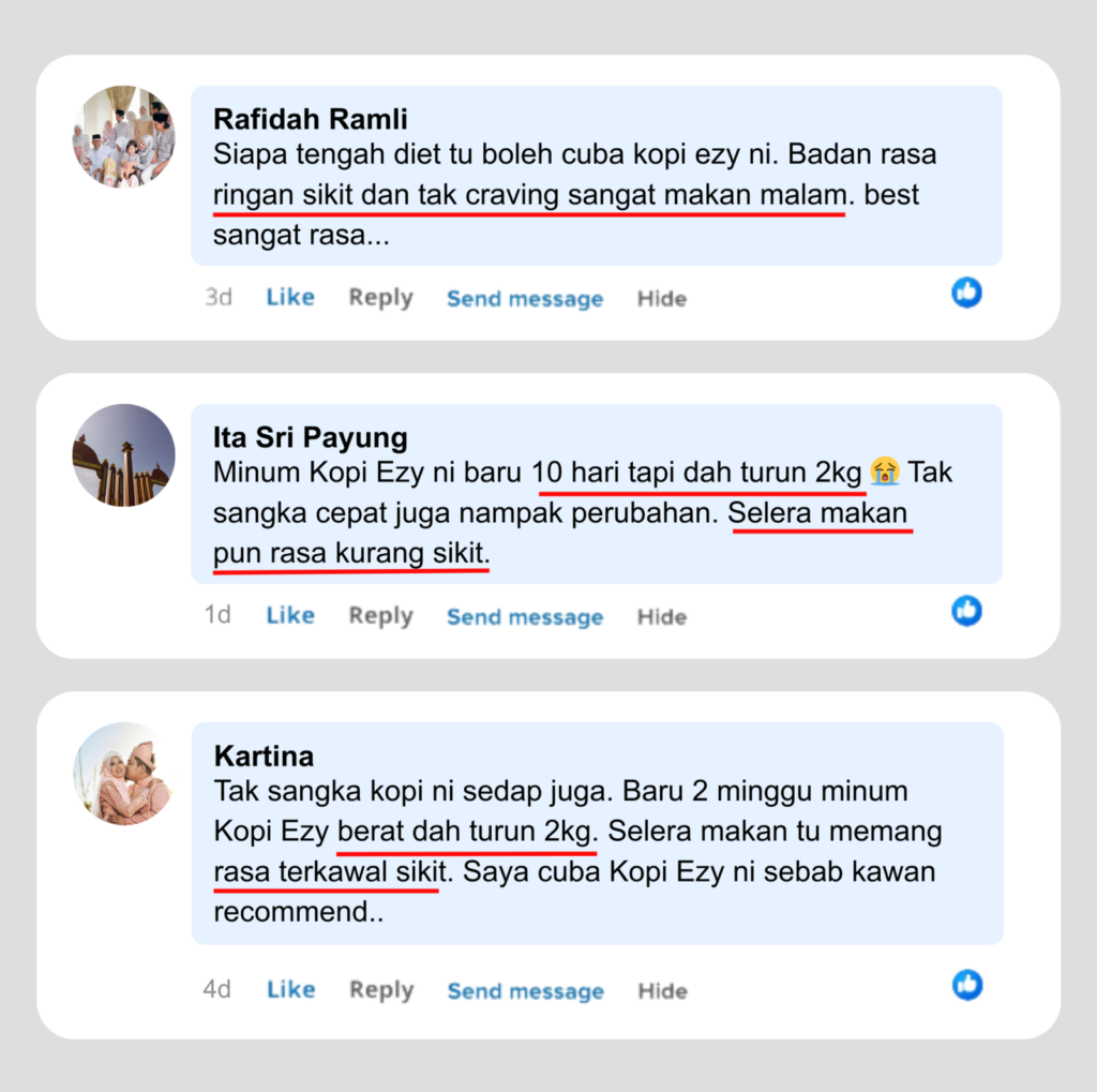 Kesan mungkin berbeza bagi setiap individu, tetapi kebanyakan pengguna mula merasai perubahan seperti selera makan lebih terkawal dan badan rasa lebih ringan selepas penggunaan secara konsisten.
